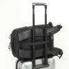 ●キャリーオン機能付きなので、出張などでのキャリーケースとの併用も可能です。リュックの背面にキャリーケースのバーを通し、簡単にセットアップできます。両手がふさがらないので便利です。