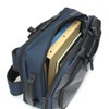 ●二層式の前面側メインルームはスマートフォンやデジタルガジェット類の収納に便利なマルチポケットレイアウト。(前面側にポケット×2、背面側にファスナーポケット×1・その手前にメッシュファスナーポケット×1)リュック時の縦持ち・ブリーフ時の横持ちにしても収納物がバラバラにならないようにポケットはベルクロ付き・ファスナーポケット対応です。