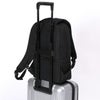 ●キャリーオン機能付きなので、出張などでのキャリーケースとの併用も可能です。リュックの背面にキャリーケースのバーを通し、簡単にセットアップできます。両手がふさがらないので便利です。