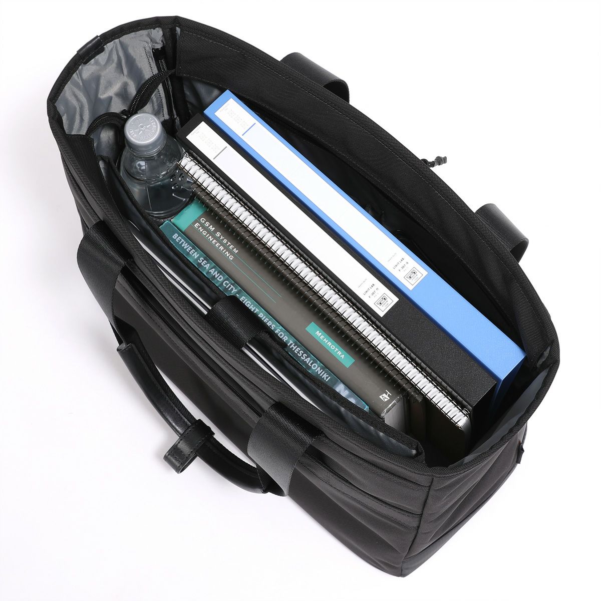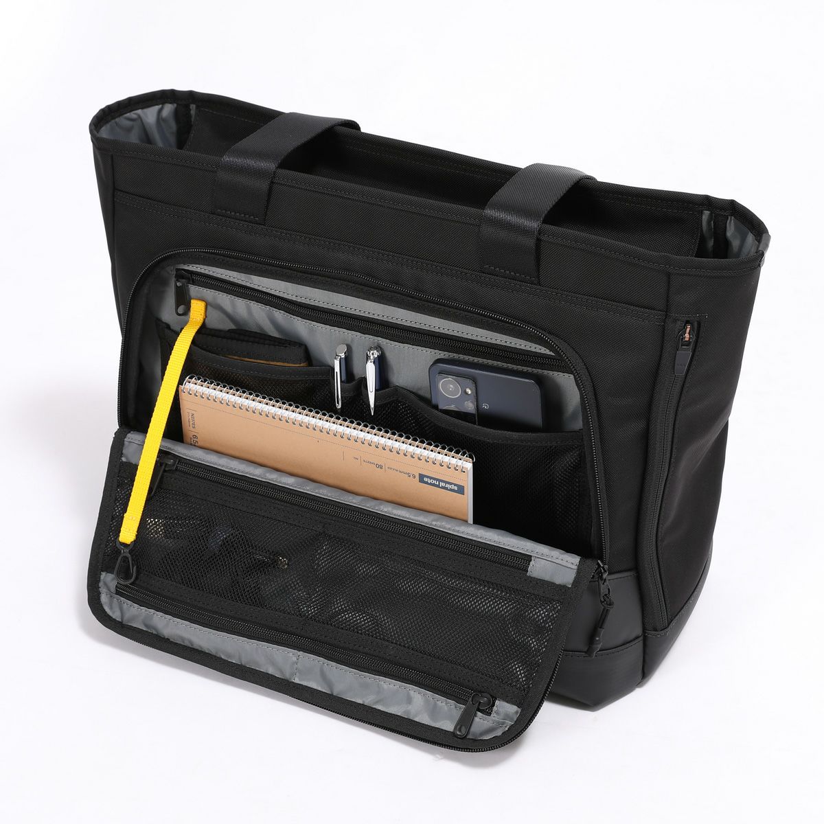 ●メインルームは開口部が大きく開いて内容物が確認しやすく書類等の出し入れもスムーズです。トートならではの広々した空間となっております。