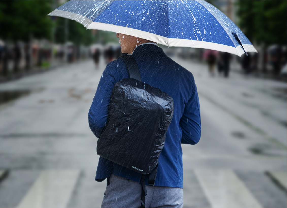 水濡れに強い撥水性の高い本体生地や取り外し可能なレインカバーを装備したモデルもラインナップしているので急な天候の変化にも対応できるので大事な書類や機器などカバンの中身をを水濡れから守ります。(※完全防水ではありません。)