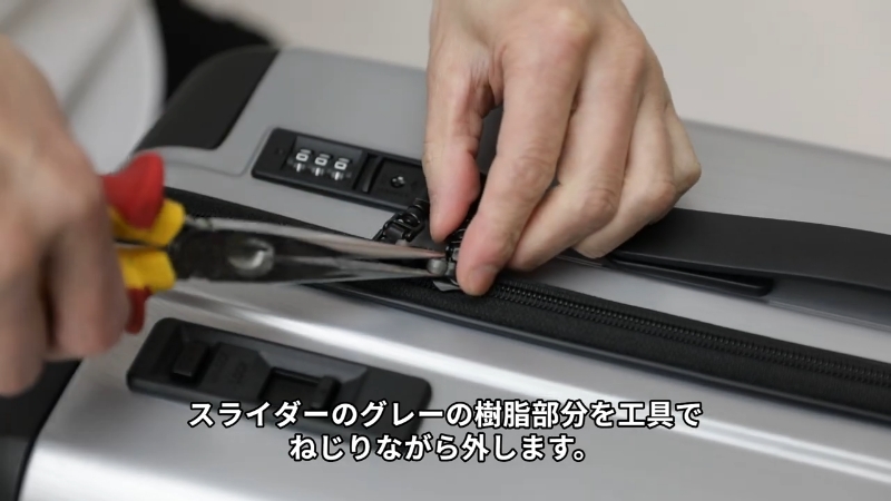 スライダーのグレーの樹脂部分を工具でねじりながら外す。