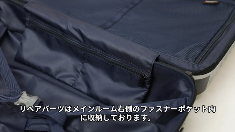 メインルーム右側のファスナーポケット内の収納袋を開封し、リペアパーツを取り出す。